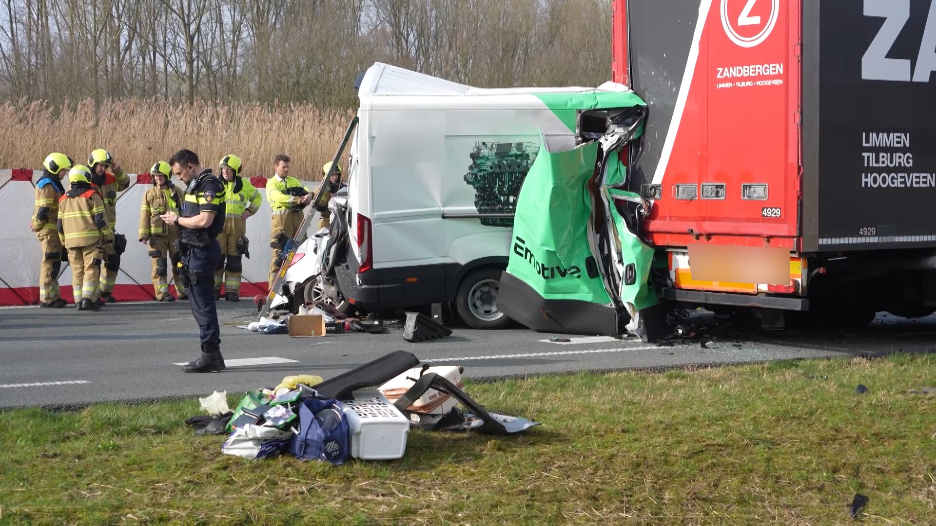 VIDEO Ernstig ongeluk op N279 bij Heeswijk-Dinther: bestelbus botst op vrachtwagen, auto belandt in sloot