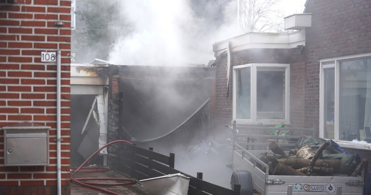 Uitslaande schuurbrand dreigt over te slaan naar woning in de Sportterreinstraat in Hoogezand