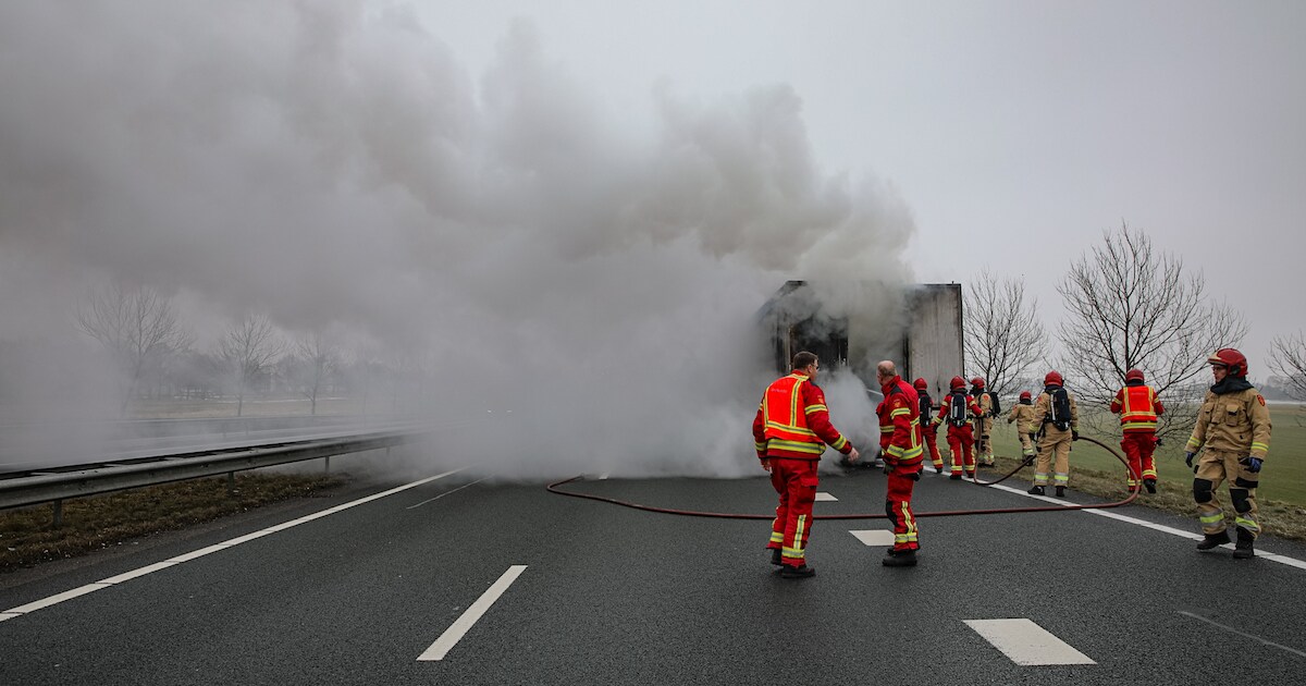 Dikke rookwolk trekt over N33 bij Veendam door brandende vrachtwagen