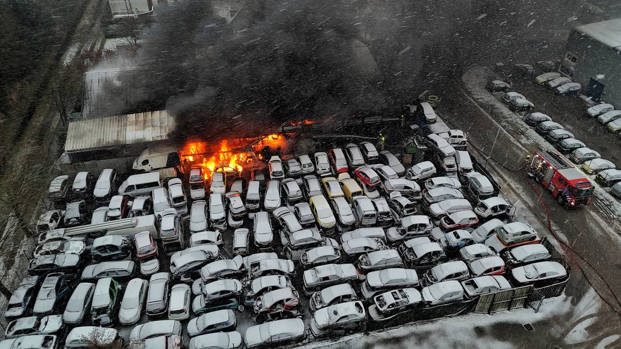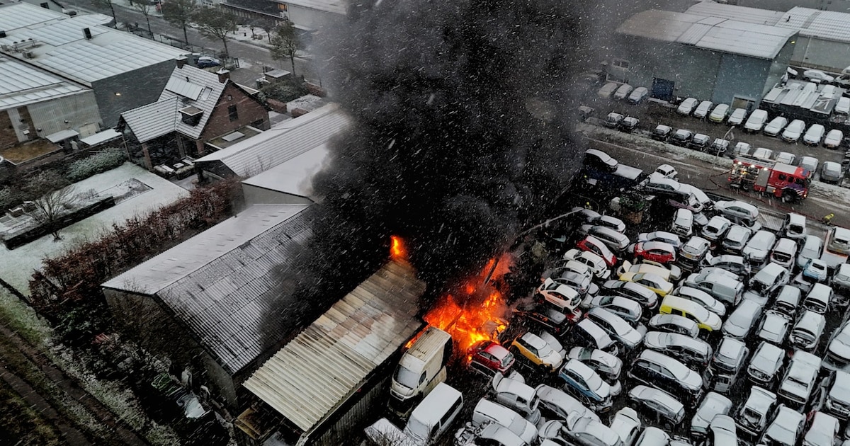 VIDEO Autowrakken vatten vlam bij sloopbedrijf: vuur slaat over naar loods