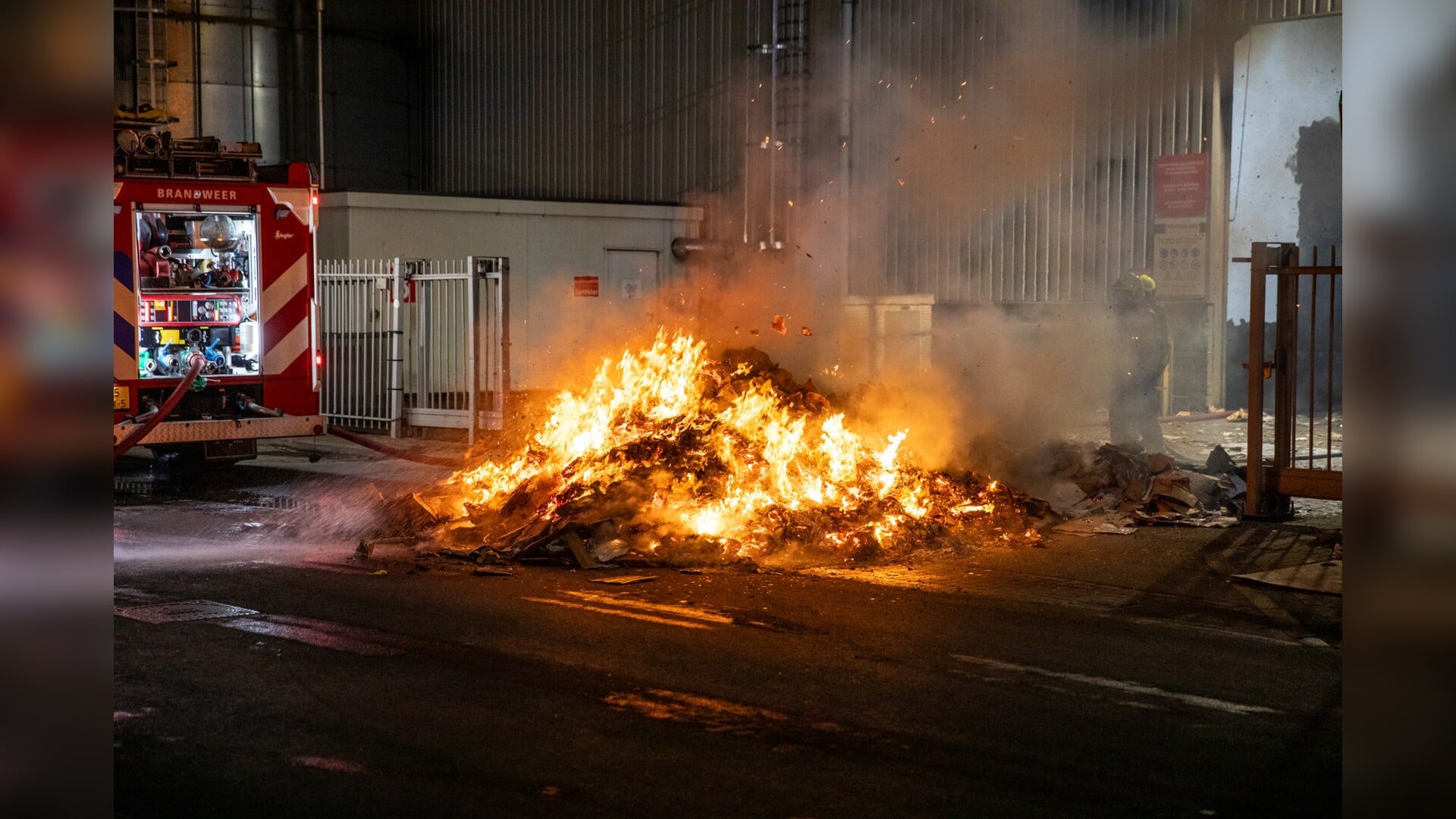 Brand bij recyclingbedrijf: stapels oud papier in brand