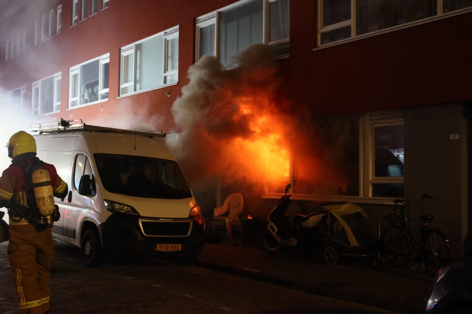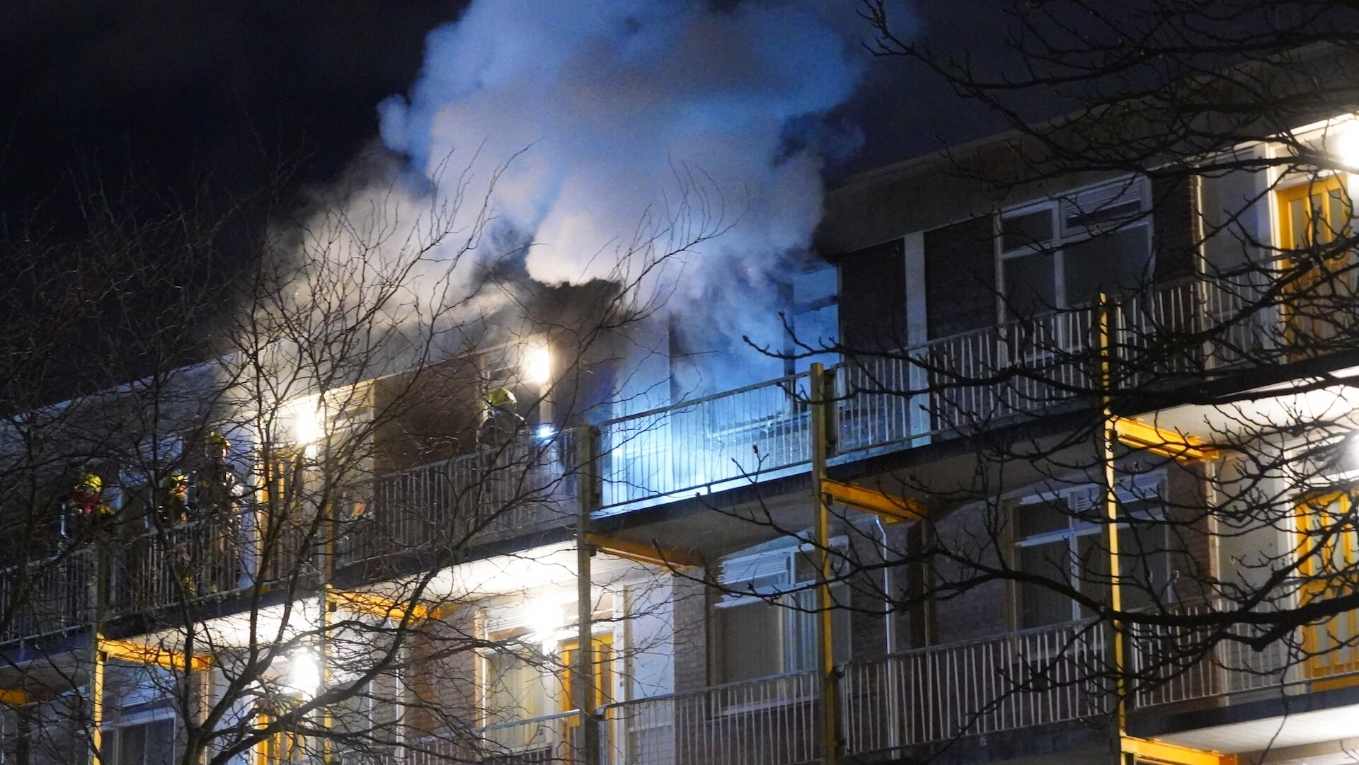 Vlammen slaan uit flatwoning in Rotterdam-Schiebroek
