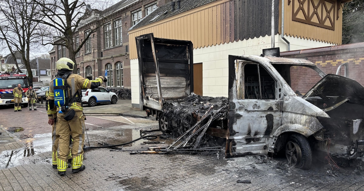 Brandende bestelbus zorgt voor schade aan auto, lantaarnpaal en huis in Utrecht